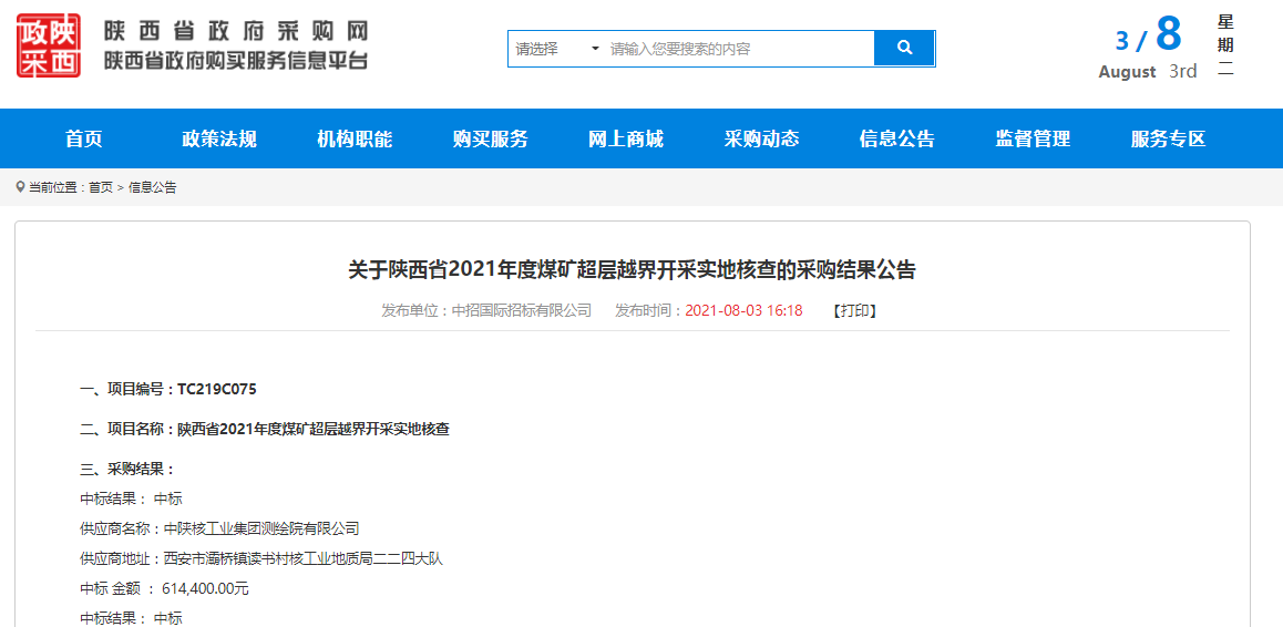 8月3日在陜西省政府采購網(wǎng)獲悉,中陜核測(cè)繪院成功中標(biāo)陜西省2021年度煤礦超層越界開采實(shí)地核查項(xiàng)目第一標(biāo)段,中標(biāo)金額為61.44萬元。